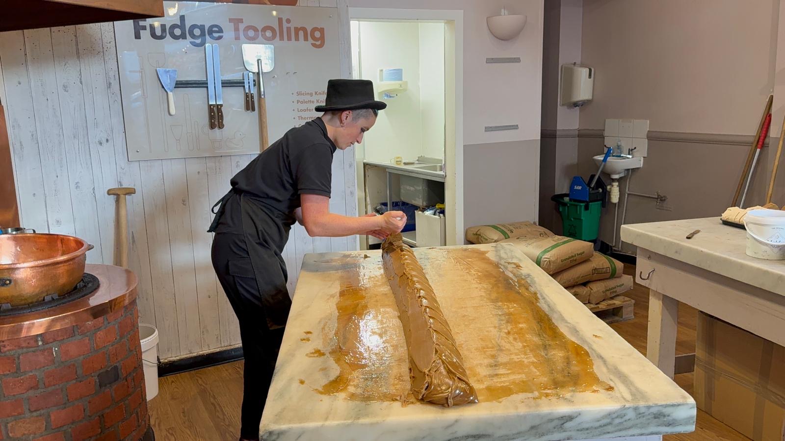 Schottland überzeugte uns, daß es ein Schlemmerland ist mit erstaunlichen Schokoladenüberraschungen. In Edinburgh ist dies der Futch, den wir bei seiner Entstehung beobachten und riechen konnten. Das ist eine schokomäßige Süßigkeit, die in sehr unterschiedlichen Würzungen und Krokant-Anteilen ganz appetitlich duftet. In einem kleinen Innenstadt-Ladenlokal köchelten 17 kg, die dann auf einen dicken, umrandeten Marmortisch gegossen wurden, wo sie nicht nur abkühlten sondern auch ständig durchgeknetet wurden. Sowas nahmen wir dann in dicken Scheiben mit, und verwunderlicherweise ist es noch nicht ganz alle!